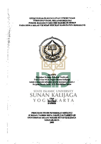 Siti Ulfah, NIM.: 01450626 (2005) EFEKTIVITAS PEMANFAATAN LINGKUNGAN TERHADAP HASIL BELAJAR BIOLOGI POKOK BAHASAN CIRI-CIRI MAKHLUK HIDUP PADA SISWA KELAS VII MTsN SUSUKAN KABUPATEN SEMARANG. Skripsi thesis, UIN SUNAN KALIJAGA YOGYAKARTA.