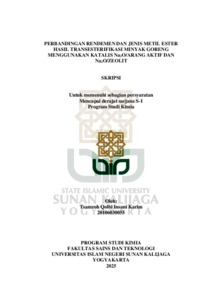 Tsamroh Qolbi Insani Karim, NIM.: 20106030055 (2025) PERBANDINGAN RENDEMEN DAN JENIS METIL ESTER HASIL TRANSESTERIFIKASI MINYAK GORENG MENGGUNAKAN KATALIS Na2O/ARANG AKTIF DAN Na2O/ZEOLIT. Skripsi thesis, UIN SUNAN KALIJAGA YOGYAKARTA.