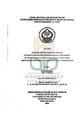 Ilya s Zamali, NIM: 97362904 (2004) MASLAHAH DALAM HUKUM ISLAM STUDI PERBANDINGAN PANDANGAN IMAM AL-GAZALI DAN NAJMUDDIN AT-TUFI. Skripsi thesis, UIN SUNAN KALIJAGA YOGYAKARTA.