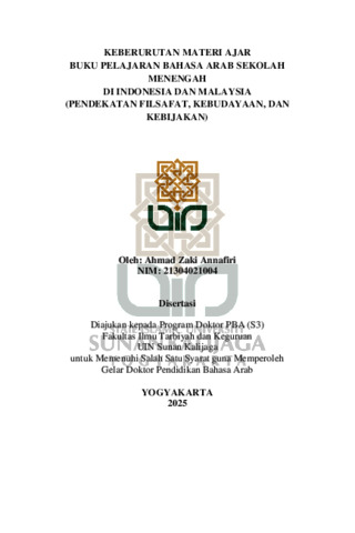Ahmad Zaki Annafiri, NIM.: 21304021004 (2025) KEBERURUTAN MATERI AJAR BUKU PELAJARAN BAHASA ARAB SEKOLAH MENENGAH DI INDONESIA DAN MALAYSIA (PENDEKATAN FILSAFAT, KEBUDAYAAN, DAN KEBIJAKAN). Doctoral thesis, UIN SUNAN KALIJAGA YOGYAKARTA.