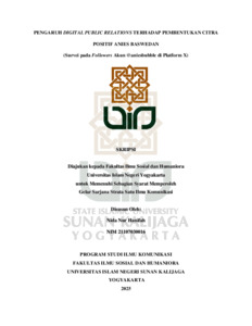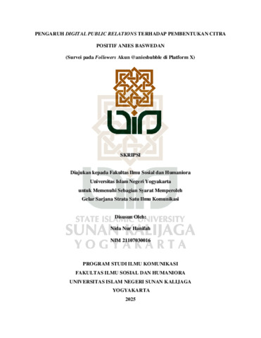 Nida Nur Hanifah, NIM.: 21107030016 (2025) PENGARUH DIGITAL PUBLIC RELATIONS TERHADAP PEMBENTUKAN CITRA POSITIF ANIES BASWEDAN (SURVEI PADA FOLLOWERS AKUN @ANIESBUBBLE DI PLATFORM X). Skripsi thesis, UIN SUNAN KALIJAGA YOGYAKARTA.