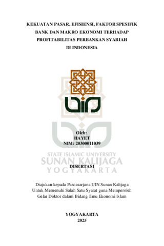 Hayet, NIM.: 20300011039 (2025) KEKUATAN PASAR, EFISIENSI, FAKTOR SPESIFIK BANK DAN MAKRO EKONOMI TERHADAP PROFITABILITAS PERBANKAN SYARIAH DI INDONESIA. Doctoral thesis, UIN SUNAN KALIJAGA YOGYAKARTA.