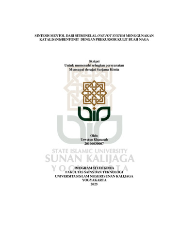 Uswatun Khasanah, NIM.: 20106030007 (2025) SINTESIS MENTOL DARI SITRONELAL ONE POT SYSTEM MENGGUNAKAN KATALIS (NI)/BENTONIT DENGAN PREKURSOR KULIT BUAH NAGA. Skripsi thesis, UIN SUNAN KALIJAGA YOGYAKARTA.