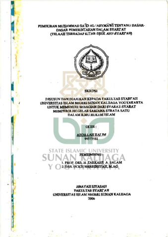 Negara kebangsaan Indonesia yang berdasarkan Pancasila adalah sesuatu yang final dan comfortable. Namun setelah runtuhnya rezim Soeharto, menjamurlah gerakan-garakan Islam di luar mainstream yang menuntut pemberlakuan syariat, pendirian negara Islam atau khilifah, sampai revitalisasi Piagam Madinah. Dalam kerangka demokrasi, hal itu sah adanya. Namun jika dihadapkan dengan realitas Indonesia sebagai negara kebangsaan yang multikultural, apa yang menjadi tuntutan mereka akan menjadi sesuatu yang kontraproduktif dan bahkan bisa berfungsi disintegatif. Skripsi ini, sebagai sebuah penelitian kepustakaan yang bersifat deskriptif-analitik, menggambarkan pandangan-pandangan Muhammad Sa'1d al'Asymi dalam bukunya Usul asy-Syari'ah tentang dasar-dasar pemerintahan menurut syariat, menentukan karakteristik pandangan beliau, dan menunjukkan signifikansi pemikirannya terhadap konteks Indonesia pasca Orde Baru yang ditandai dengan berkembangnya gerakan-gerakan Islam baru dengan tuntutan tuntutan mereka seperti disebutkan di awal. Pandangan beliau setidaknya ada tiga poin. Pertama, syariat pada maknanya yang