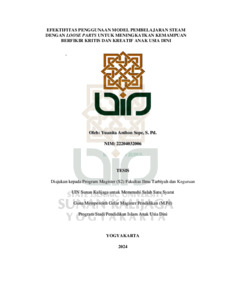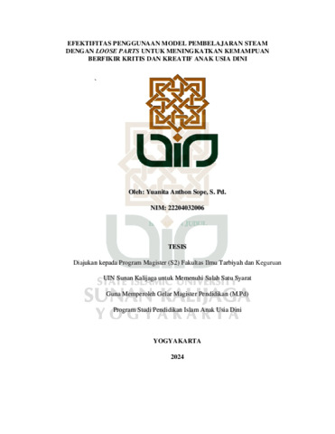 Yuanita Anthon Sope, S. Pd., NIM.: 22204032006. (2024) EFEKTIFITAS PENGGUNAAN MODEL PEMBELAJARAN STEAM DENGAN LOOSE PARTS UNTUK MENINGKATKAN KEMAMPUAN BERFIKIR KRITIS DAN KREATIF ANAK USIA DINI. Masters thesis, UIN SUNAN KALIJAGA YOGYAKARTA.