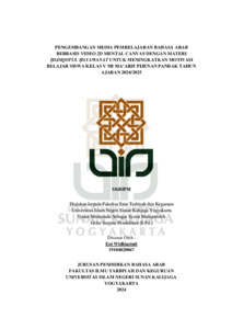 Penelitian ini dilatarbelakangi oleh pemanfaatan media pembelajaran yang belum maksimal oleh tenaga pendidik di era digital ini. Adapun tujuannya untuk mengembangkan video pembelajaran bahasa Arab berbasis video 2D mental canvas, mengetahui bagaimana mengembangan video 2D mental canvas, mengetahui kelayakan video pembelajaran 2D mental canvas, dan untuk mengetahui respon siswa kelas V MI Ma’arif Pijenan Pandak terhadap video pembelajaran 2D mental canvas. Penelitian ini menggunakan jenis penelitian dan pengembangan model Borg & Gall yang terdiri dari 10 tahapan yaitu, potensi dan masalah, pengumpulan data, desain produk, validasi desain, revisi desain, ujicoba produk, revisi produk, ujicoba pemakaian, revisi produk akhir, dan produksi masal. Kualitas produk dinilai oleh dua validator yaitu, 1 ahli materi dari guru bahasa Arab, 1 ahli media dan direspon oleh 5 siswa pada ujicoba terbatas dengan pemilihan acak dan 23 siswa pada ujicoba pemakaian. Instrumen yang digunakan pada penelitian ini berbentuk angket untuk menilai kualitas produk dan angket respon siswa terhadap produk pengembangan tersebut. Teknik analisis data menggunakan kualitatif dan kuantitatif. Hasil dari penelitian dan pengembangan ini berupa video pembelajaran bahasa Arab berbasis video 2D mental canvas. Kualitas dari produk video pembelajaran bahasa Arab berbasis 2D mental canvas untuk siswa kelas V MI Ma’arif Pijenan Pandak menurut ahli materi mendapatkan skor rata-rata 4.93 dengan presentase skor 98.57% termasuk dalam kriteria penilaian Sangat Baik (SB). Penilaian ahli media memperoleh skor rata-rata 4.88 dengan presentase skor 97.50% termasuk dalam kriteria penilaian Sangat Baik (SB). Respon siswa terhadap video pembelajaran bahasa Arab berbasis video 2D mental canvas pada uji terbatas memperoleh skor rata-rata 4.26 dengan presentase skor 85.20% termasuk dalam kriteria penilaian Sangat Setuju (SS), pada ujicoba pemakaian oleh 23 siswa mendapat skor rata-rata 4.51 dengan presentase skor 90.26% termasuk dalam kriteria penilaian Sangat Setuju (SS).