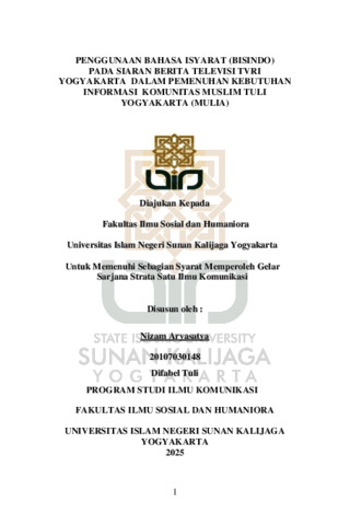 Nizam Aryasatya, NIM.: 20107030148 (2025) PENGGUNAAN BAHASA ISYARAT (BISINDO) PADA SIARAN BERITA TELEVISI TVRI YOGYAKARTA DALAM PEMENUHAN KEBUTUHAN INFORMASI KOMUNITAS MUSLIM TULI YOGYAKARTA (MULIA). Skripsi thesis, UIN SUNAN KALIJAGA YOGYAKARTA.