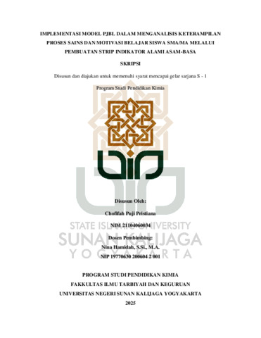 Chofifah Puji Pristiana, NIM.: 21104060034 (2025) IMPLEMENTASI MODEL PJBL DALAM MENGANALISIS KETERAMPILAN PROSES SAINS DAN MOTIVASI BELAJAR SISWA SMA/MA MELALUI PEMBUATAN STRIP INDIKATOR ALAMI ASAM-BASA. Skripsi thesis, UIN SUNAN KALIJAGA YOGYAKARTA.