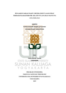 Vadya Kautsar Yanuba, NIM.: 21106030050 (2025) PENGARUH VARIASI WAKTU PRETREATMENT ASAM SITRAT TERHADAP KARAKTERISTIK GELATIN TULANG IKAN MANYUNG (Arius thalassinus). Skripsi thesis, UIN SUNAN KALIJAGA YOGYAKARTA.