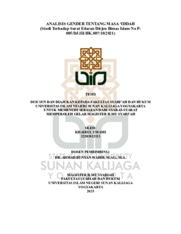 Khairul Umami, NIM.: 22203012113 (2025) ANALISIS GENDER TENTANG MASA ‘IDDAH (STUDI TERHADAP SURAT EDARAN DIRJEN BIMAS ISLAM NO P-005/DJ.III/HK.007/10/2021). Masters thesis, UIN SUNAN KALIJAGA YOGYAKARTA.