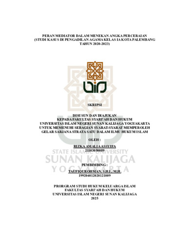 Rizka Amalia Assyifa, NIM.: 21103050089 (2025) PERAN MEDIATOR DALAM MENEKAN ANGKA PERCERAIAN (STUDI KASUS DI PENGADILAN AGAMA KELAS IA KOTA PALEMBANG TAHUN 2020-2023). Skripsi thesis, UIN SUNAN KALIJAGA YOGYAKARTA.