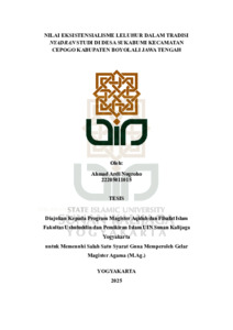 Nyadran adalah satu tradisi yang berkembang di kalangan masyarakat Jawa, tradisi ini bukan semata sebagai formalitas atau kegiatan budaya yang kosong dari nilai-nilai. Disisi lain nilai-nilai yang ada dibalik sebuah tradisi itulah yang selama ini terus dijaga dan dilestarikan oleh masyarakat Jawa salah satunya adalah nilai eksistensialisme yang diwariskan oleh para leluhur, oleh sebab itu penelitian ini berangkat dari analisis terhadap nilai-nilai eksistensialisme yang terkandung dalam tradisi Nyadran. Tujuan dari penelitian ini adalah untuk menggali dan menganalisis nilai-nilai eksistensialisme leluhur dalam tradisi Nyadran di Desa Sukabumi Kecamatan Cepogo Kabupaten Boyolali Jenis penelitian tesis ini adalah penelitian lapangan (field research) dengan pendekatan penelitian kualitatif. Sumber data utama diambil dari observasi lapangan yang dilakukan di Desa Sukabumi Kecamatan Cepogo Kabupaten Boyolali Jawa Tengah, adapun aspek yang hendak diteliti adalah tradisi Nyadran. Sumber data sekunder diambil dari bahan literatur seperti buku, artikel journal, web yang berkaitan dengan topik penelitian. Teknik pengumpulan dilakukan melalui tiga tahapan yaitu observasi, interview/wawancara, dan dokumentasi terstruktur. Hasil dari penelitian ini menunjukkan bahwa: Pertama, nilai-nilai eksistensialisme leluhur yang terkandung dalam tradisi Nyadran adalah: (1) Kesadaran manusia akan keberadaan Tuhan melalui hubungan spiritual yang diekspresikan dalam tradisi Nyadran, (2) Tradisi Nyadran menekankan pada individualitas manusia khususnya dalam aspek eksistensi manusia sebagai pelaku budaya yang dinamis dan kreatif sehingga dengan keberadaannya ini manusia dapat terus menjaga nilai-nilai budayanya, (3) Nilai-nilai selanjutnya adalah kebebasan individu dalam menjaga nilai-nilai para leluhurnya, melalui kebebasannya manusia dapat menginternalisasikan nilai-nilai yang terkandung dalam tradisi Nyadran dan aktualisasinya dalam kehidupan sehari-hari, (4) Nilai yang terakhir adalah tanggung jawab sosial dalam melestarikan warisan budayanya, tradisi Nyadran memberikan pelajaran bahwa untuk menjaga warisan budaya merupakan tanggung jawab bersama. Kedua, tradisi Nyadran memiliki makna filosofis yang dalam bagi masyarakat Desa Sukabumi Kecamatan Cepogo Kabupaten Boyolali. Makna itu diserap melalui rentetan kegiatan Nyadran mulai dari ritual di malam Nisfu Sya’ban, Besik Makam leluhur dan keluarga, acara kenduri, dzikir malam dan puncaknya silaturrahim antar warga di rumah-rumah (open house). Bagi masyarakat Desa Sukabumi Kecamatan Cepogo Kabupaten Boyolali kegiatan itu semua mengandung makna antara lain: (1), meningkatkan kesalehan individu melalui shodaqoh antar sesama, (2) belajar bersikap Syukur atas nikmat yang diberikan Tuhan, (3) menjalin hubungan sosial yang harmonis, (4) meningkatkan kualitas hubungan dengan sesama manusia (hablum min an-nas) dan hubungan dengan Tuhan (hablum min Allah).