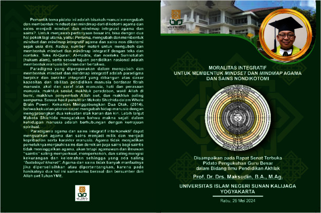 Text (Moralitas Integratif untuk Membentuk Mondset dan Mindmap Agama dan Sains Nondikotomi ( Pidato Pengukuhan Guru Besar dalam Bidang Ilmu Pendidikan Akhlak oleh Prof. Dr. Drs. Maksudin, BA., M.Ag.)