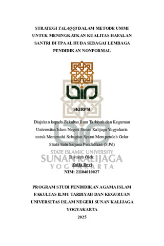 Zulfa Devi, NIM.: 21104010027 (2025) STRATEGI TALAQQI DALAM METODE UMMI UNTUK MENINGKATKAN KUALITAS HAFALAN SANTRI DI TPA AL HUDA SEBAGAI LEMBAGA PENDIDIKAN NONFORMAL. Skripsi thesis, UIN SUNAN KALIJAGAYOGYAKARTA.
