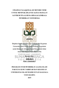 Strategi menghafal Al-Qur’an di lembaga pendidikan nonformal merupakan salah satu hal yang perlu diperhatikan guna memaksimalkan pencapaian tujuan pembelajaran, karena dalam melafalkan Al-Qur’an mempunyai kaidah dan aturan tersendiri. Pembelajaran di lembaga pendidikan nonformal seperti TPA yang diselenggarakan di masjid dusun umumnya kurang diperhatikan dan belum memiliki sistem pembelajaran yang baik, sehingga kualitas hafalan santri juga kurang maksimal. Berbagai tantangan dan hambatan yang terjadi dalam proses belajar menghafal Al-Qur’an di lembaga pendidikan nonformal dicari untuk memilimalisir dampak negatifnya. Santri yang belum bisa membaca Al-Qur’an tentu bisa memiliki hafalan yang berkualitas dengan adanya strategi menghafal Al-Qur’an yang tepat. Strategi talaqqi dalam metode Ummi memiliki pendekatan langsung berhadapan antara guru dan santri, cara menghafal ayat demi ayat dengan contoh dan koreksi langsung dari guru. Metode Ummi memiliki sistem pembelajaran yang terstruktur untuk memaksimalkan tercapainya tujuan pembelajaran. Dengan adanya kerjasama yang baik dari pengelolaan lembaga dan guru yang berkualitas maka akan mendukung tercapainya tujuan pembelajaran. Penelitian ini merupakan jenis penelitian deskriptif kualitatif yang bertujuan untuk menggambarkan fenomena secara mendalam. Penelitian ini mengidentifikasi penerapan, kendala, hal-hal yang menjadi sebab peningkatan kualitas hafalan, dan dampak penerapan strategi talaqqi dalam metode Ummi terhadap peningkatan viii kualitas hafalan santri. Pengumpulan data dilakukan dengan cara observasi, wawancara, dan dokumentasi. Terdapat dua sumber data yang didapatkan dalam penelitian ini, sumber data primer yang diperoleh langsung dari informan yakni pengelola TPA Al Huda, guru metode Ummi, dan santri, serta observasi pembelajaran yang langsung dilakukan peneliti. Sedangkan sumber data sekunder diperoleh dari wawancara dengan wali santri dan beberapa sumber tertulis. Adapun teknik analisis data yang digunakan dalam penelitian ini setelah mengumpulkan data, yakni reduksi data, penyajian data, dan penarikan kesimpulan. Keabsahan data dilakukan dengan triangulasi sumber dan triangulasi teknik, perpanjangan observasi, dan peer debriefing. Hasil penelitian menunjukkan (1) Penerapan strategi talaqqi dalam metode Ummi dilakukan dengan lima langkah yakni pengondisian santri, penanaman konsep, pemahaman konsep, keterampilan, dan evaluasi. (2) Kendala yang dihadapi dalam penerapan strategi talaqqi dalam metode Ummi di TPA Al Huda adalah kondisi santri yang kurang fokus, terdapat beberapa huruf yang terdengar mirip, dan kemampuan santri yang beragam. (3) Strategi talaqqi dalam metode Ummi dapat meningkatkan kualitas hafalan santri karena strategi talaqqi merupakan strategi efektif menggunakan pendekatan langsung antara guru dan santri, memiliki guru yang bermutu, sistem evaluasi yang terstruktur, murajaah (mengulang hafalan), dan dukungan orangtua. (4) Dampak penerapan strategi talaqqi dalam metode Ummi adalah peningkatan kualitas hafalan santri. Kata Kunci: Strategi Talaqqi, Kualitas Hafalan, Lembaga Pendidikan Nonformal.