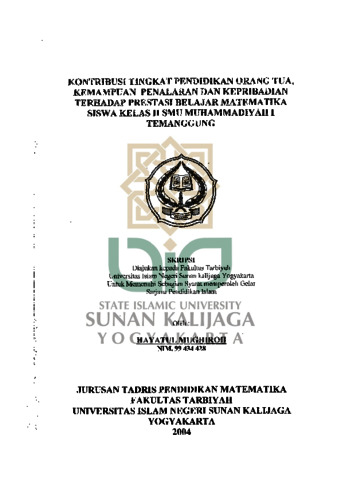 Hayatul Mughiroh, NIM.: 99434428 (2004) KONTRIBUSI TINGKAT PENDIDIKAN ORANG TUA, KEMAMPUAN PENALARAN DAN KEPRIBADIAN TERHADAP PRESTASI BELAJAR MATEMATIKA SISWA KELAS II SMU MUHAMMADIYAH I TEMANGGUNG. Skripsi thesis, UIN SUNAN KALIJAGA YOGYAKARTA.