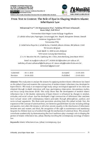 Muhammad Nur, - and Siti Maymanatun Nisa, - and Tashdieq Ulil Amri Arhamzah, - and Imaro Sidqi, - and Doli Witro, - (2025) From Text to Context: The Role of Kyai in Shaping Modern Islamic Inheritance Law. Al-Manāhij: Jurnal Kajian Hukum Islam, 19 (1). pp. 31-50. ISSN P-ISSN: 1978-6670 | E-ISSN: 2579-4167