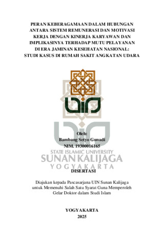 Bambang Setyo Gunadi, NIM.: 19300016165 (2025) PERAN KEBERAGAMAAN DALAM HUBUNGAN ANTARA SISTEM REMUNERASI DAN MOTIVASI KERJA DENGAN KINERJA KARYAWAN DAN IMPLIKASINYA TERHADAP MUTU PELAYANAN DI ERA JAMINAN KESEHATAN NASIONAL: STUDI KASUS DI RUMAH SAKIT ANGKATAN UDARA. Skripsi thesis, UIN SUNAN KALIJAGA YOGYAKARTA.