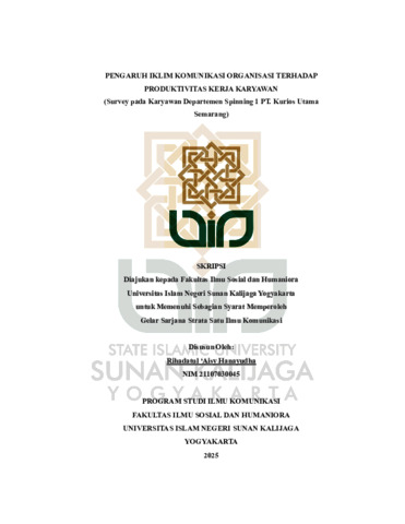 Rihadatul ‘Aisy Hanayudha, NIM.: 21107030045 (2025) PENGARUH IKLIM KOMUNIKASI ORGANISASI TERHADAP PRODUKTIVITAS KERJA KARYAWAN (SURVEY PADA KARYAWAN DEPARTEMEN SPINNING 1 PT. KURIOS UTAMA SEMARANG). Skripsi thesis, UIN SUNAN KALIJAGA YOGYAKARTA.