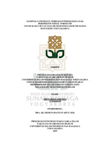 Fenomena fatherless, yang marak terjadi karena kurangnya sosok ayah secara fisik dan psikologis, telah berkembang menjadi masalah yang serius di seluruh dunia yang berdampak negatif pada perkembangan anak. Banyak faktor yang berkontribusi pada masalah ini di Indonesia dan kemudian anak mengalami ketidakseimbangan perkembangan psikologis, yang dapat menyebabkan berbagai masalah. Permasalahan yang dikaji dalam penelitian ini meliputi: (1) Bagaimana dampak fatherless terhadap psikologis anak di Yayasan Rumah Singgah Bumi Damai Kotagede Yogyakarta perspektif Sosial, (2) Bagaimana dampak fatherless terhadap psikologis anak di Yayasan Rumah Singgah Bumi Damai Kotagede Yogyakarta perspektif Normatif, jenis penelitian yang digunakan dalam penulisan skripsi ini adalah penelitian lapangan (field research) yang bersifat deksriptif analisis. Teknik pengumpulan data dengan menggunakan wawancara dengan anak yang berusia rentang 12-18 tahun dan dokumentasi. Pendekatan penelitian ini menggunakan metode pendekatan Sosial, yakni dengan menggunakan teori dari Psikososial Erik H. Erikson dan pendekatan Normatif fengan menggunakan Al-Qur’an At-Tahrim ayat 6. Sedangkan untuk analisis datanya dengan menggunakan analisis data kualitatif yang bersifat deduktif. Teknik analisa yang digunakan dalam penelitian ini menggunakan model Milles dan Hubermaan yang meliputi data, penyajian data, dan kesimpulan. Hasil penelitian ini menunjukkan bahwa dampak dari fatherless cukup memengaruhi psikologis anak dalam menjalankan kehidupannya. Anak-anak yang terdampak dalam situasi kehilangan figur ayah ini cenderung mengalami kesulitan dalam membentuk identitas diri, lebih rentan terhadap kecemasan, serta memiliki keterampilan yang kurang dalam mengelola emosi mereka. Dalam keluarga, keberadaan ayah sangat penting untuk menanamkan nilai-nilai moral, disiplin, dan menjadi teladan yang baik bagi anak. Selain itu, penelitian ini juga mengidentifikasi berbagai faktor penyebab fatherless, seperti perceraian, kematian, budaya patriarki, dan tuntutan pekerjaan yang membuat ayah kurang terlibat dalam kehidupan anak. Dari perspektif sosial, keberadaan ayah dalam pengasuhan berkontribusi pada keseimbangan perkembangan psikologis dan sosial anak. Sementara itu, perspektif normatif yang diambil dari Al-Qur'an menegaskan bahwa seorang ayah memiliki kewajiban untuk mendidik dan membimbing anak menuju kehidupan yang baik dan berakhlak.