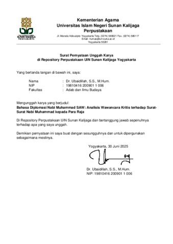 Bahasa Diplomasi Nabi Muhammad SAW Analisis Wawancara Kritis terhadap Surat-Surat Nabi Muha.pdf - Published Version Restricted to Registered users only Download (3MB) |