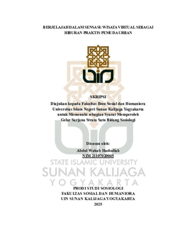 Abdul Wahab Hasbullah, NIM.: 21107020045 (2025) BERJELAJAH DALAM SENSASI: WISATA VIRTUAL SEBAGAI HIBURAN PRAKTIS PEMUDA URBAN. Skripsi thesis, UIN SUNAN KALIJAGA YOGYAKARTA.