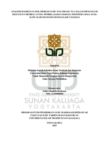 Indira Maulida Rachman, NIM.: 21104080050 (2025) ANALISIS HAMBATAN KOLABORASI GURU DAN ORANG TUA DALAM MENANGANI KESULITAN MEMBACA PADA PEMBELAJARAN BAHASA INDONESIA BAGI ANAK SLOW LEARNER DI SDN SENDANGADI 2 SLEMAN. Skripsi thesis, UIN SUNAN KALIJAGA YOGYAKARTA.