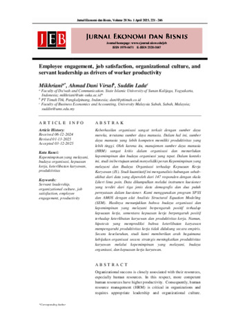 Mikhriani, -- and Ahmad Dani Virsal, - and Suddin Lada, - (2025) Employee engagement, job satisfaction, organizational culture, and servant leadership as drivers of worker productivity. Jurnal Ekonomi dan Bisnis, 28 (1). pp. 221-246. ISSN ISSN 1979-6471 E-ISSN 2528-0147