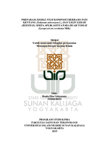 Rania Eka Cahyarany, NIM.: 21106030022 (2025) PREPARASI EDIBLE FILM KOMPOSIT BERBASIS PATI KENTANG (Solanum tuberosum L.) DAN LILIN LEBAH (BEESWAX) SERTA APLIKASINYA PADA BUAH TOMAT (Lycopersicon esculanta Mill.). Skripsi thesis, UIN SUNAN KALIJAGA YOGYAKARTA.