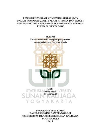 Riska Diani, NIM.: 21106030055 (2025) PENGARUH VARIASI KONSENTRASI BESI (Fe3+) DALAM KOMPOSIT ZEOLIT ALAM-KITOSAN DAN ZEOLIT SINTESIS-KITOSAN TERHADAP PERFORMANYA SEBAGAI PUPUK SLOW RELEASE. Skripsi thesis, UIN SUNAN KALIJAGA YOGYAKARTA.