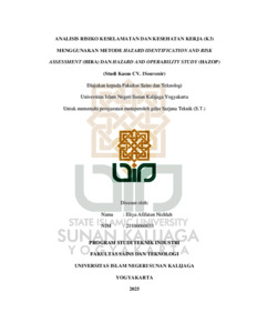 Eliya Afifatun Nichlah, NIM.: 21106060033 (2025) ANALISIS RISIKO KESELAMATAN DAN KESEHATAN KERJA (K3) MENGGUNAKAN METODE HAZARD IDENTIFICATION AND RISK ASSESSMENT (HIRA) DAN HAZARD AND OPERABILITY STUDY (HAZOP) (STUDI KASUS CV. 1SOUVENIR). Skripsi thesis, UIN SUNAN KALIJAGA YOGYAKARTA.