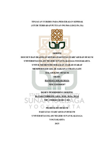 Hanessy Sekar Roja, NIM.: 21103040207 (2025) TINJAUAN YURIDIS PADA PERCERAIAN SEPIHAK (STUDI TERHADAP PUTUSAN 591/Pdt.G/2012/PA.Yk). Skripsi thesis, UIN SUNAN KALIJAGA YOGYAKARTA.