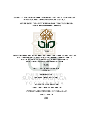 Septiyan Faqiyyuddin S.H., NIM.: 22203011023 (2025) NEGOSIASI PEMENUHAN NAFKAH OLEH SUAMI YANG MASIH TINGGAL DI PONDOK PESANTREN TERHADAP KELUARGA (STUDI KASUS PADA SANTRI DI PONDOK PESANTREN HM AL-MAHRUSIYAH LIRBOYO KEDIRI). Masters thesis, UIN SUNAN KALIJAGA YOGYAKARTA.