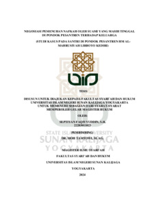 Tesis ini mengkaji tentang strategi pemenuhan nafkah suami yang masih tinggal di pondok pesantren terhadap keluarga studi kasus pada santri di pondok pesantren HM Al-Mahrusiyah Lirboyo Kediri. Penyusunan ini berangkat dari santri yang menikah dengan istrinya yang mana suami tersebut masih menjadi santri dalam menyelesaikan pendidikan dan pengabdiannya, sehingga pernikahan santri tersebut masih memiliki keterbatasan dalam memenuhi kewajiban terhadap istrinya. Namun dalam praktiknya terdapat keragaman strategi yang dilakukan suami yang masih menjadi santri dalam pemenuhan nafkah keluarganya. Berangkat dari hal tersebut, penyusunan ini melihat bagaimana strategi suami yang tinggal di pondok pesantren dalam pemenuhan nafkah dan bagaimana upaya suami yang tinggal di pondok pesantren dalam menciptakan keluarga maslahah. Jenis penyusunan ini adalah penelitan lapangan (field research). Adapun untuk menjawab pertanyaan penyusunan, penyusun menggunakan pendekatan sosiologi hukum dari Soerjono Soekanto dengan teori maslahah dari imam al Ghozali yang di usung oleh Lembaga Kemaslahatan Keluarga Nahdlatul Ulama (LKK NU) yang dikembangkan dengan pendekatan sistem (system approach). Penyusunan ini nenggunakan metode kualitatif, adapun dalam pengumpulan data primer penyusun melakukan observasi dan wawancara. Sedangkan data sekunder penyusun peroleh dari berbagai sumber lain guna melengkapi kebutuhan penyusunan. Penyusunan ini dilakukan di pondok pesantren HM Al-Mahrusiyah Lirboyo Kediri, yang ditentukan menggunakan teknik spesifikasi. Penyusunan ini mengungkap bahwa strategi pemenuhan nafkah terhadap istri yang dilakukan suami memiliki keragaman walaupun belum terlaksana sebagaimana mestinya. Keragaman strategi yang dilakukan tersebut tidak lepas dari peran pihak lain yaitu dukungan dari pihak pondok pesantren berupa waktu yang diberikan untuk pulang ke rumah dan keluarga masing-masing pasangan, seperti yang informan sampaikan yaitu berupa bantuan dari orang tua atau mertua, dari usaha kecilnya, dan sedikit menyisihkan dari uang terima kasih dari pengabdiannya. Selanjutnya upaya suami yang tinggal di pondok pesantren dalam menciptakan keluarga maslahah yang di usung oleh LKK NU dalam memenuhi empat indikator yaitu, pertama suami istri yang sholih, kedua anak yang baik berkualitas dan berakhlak mulia, ketiga pergaulan yang baik dan keempat berkecukupan rezeki (sandang, pangan, papan). Upaya mewujudkan keluarga maslahah tersebut belum cukup baik sebagaimana suami pada semestinya dan juga yang masih dibantu oleh pihak lain hingga dinyatakan lulus.