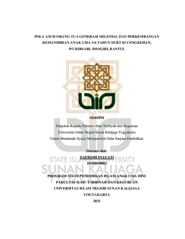 Nafiqoh Inayati, NIM.: 18104030082 (2025) POLA ASUH ORANG TUA GENERASI MILENIAL DAN PERKEMBANGAN KEMANDIRIAN ANAK USIA 5-6 TAHUN DI RT 03 CENGKEHAN, WUKIRSARI, IMOGIRI, BANTUL. Skripsi thesis, UIN SUNAN KALIJAGA YOGYAKARTA.