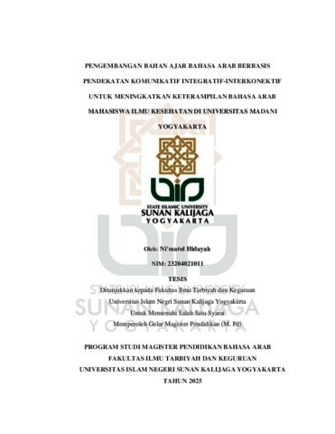 Ni’matul Hidayah, NIM.: 23204021011 (2025) PENGEMBANGAN BAHAN AJAR BAHASA ARAB BERBASIS PENDEKATAN KOMUNIKATIF INTEGRATIF-INTERKONEKTIF UNTUK MENINGKATKAN KETERAMPILAN BAHASA ARAB MAHASISWA ILMU KESEHATAN DI UNIVERSITAS MADANI YOGYAKARTA. Masters thesis, UIN SUNAN KALIJAGA YOGYAKARTA.