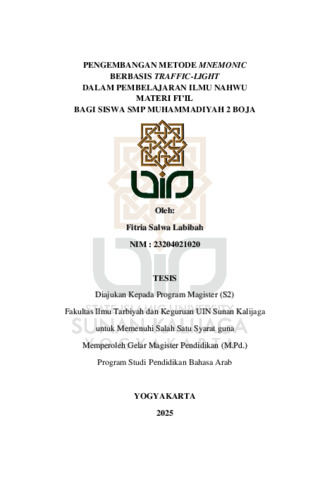 Fitria Salwa Labibah, NIM.: 23204021020 (2025) PENGEMBANGAN METODE MNEMONIC BERBASIS TRAFFIC-LIGHT DALAM PEMBELAJARAN ILMU NAHWU MATERI FI’IL BAGI SISWA SMP MUHAMMADIYAH 2 BOJA. Masters thesis, UIN SUNAN KALIJAGA YOGYAKARTA.