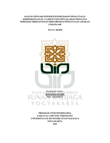 Setiawan Junaidi, NIM.: 20106050070 (2025) ANALISIS PENGARUH PERSEPSI KEMUDAHAN PENGGUNAAN, KEBERMANFAATAN, USABILITY DAN PENGALAMAN PENGGUNA TERHADAP FREKUENSI DAN REKOMENDASI PENGGUNAAN APLIKASI LOKAPASAR. Skripsi thesis, UIN SUNAN KALIJAGA YOGYAKARTA.