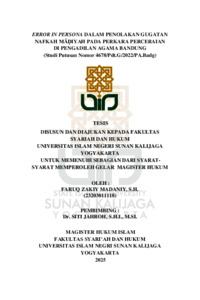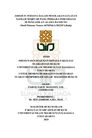 Faruq Zakiy Madaniy, S.H., NIM.: 23203011118 (2025) ERROR IN PERSONA DALAM PENOLAKAN GUGATAN NAFKAH MADIYAH PADA PERKARA PERCERAIAN DI PENGADILAN AGAMA BANDUNG (STUDI PUTUSAN NOMOR 4678/PDT.G/2022/PA.BADG). Masters thesis, UIN SUNAN KALIJAGA YOGYAKARTA.