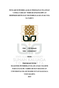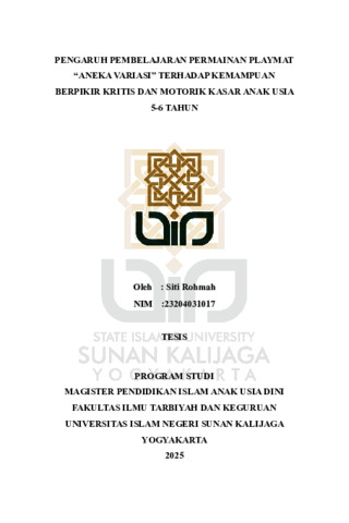 Siti Rohmah, NIM.: 23204031017 (2025) PENGARUH PEMBELAJARAN PERMAINAN PLAYMAT “ANEKA VARIASI” TERHADAP KEMAMPUAN BERPIKIR KRITIS DAN MOTORIK KASAR ANAK USIA 5-6 TAHUN. Masters thesis, UIN SUNAN KALIJAGA YOGYAKARTA.