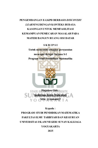 Sasikirana Zahra Maheswari, NIM.: 21104040027 (2025) PENGEMBANGAN E-LKPD BERBASIS DISCOVERY LEARNING DENGAN KONTEKS BUDAYA KASONGAN UNTUK MEMFASILITASI KEMAMPUAN PEMECAHAN MASALAH PADA MATERI BANGUN RUANG SISI DATAR. Skripsi thesis, UIN SUNAN KALIJAGAYOGYAKARTA.