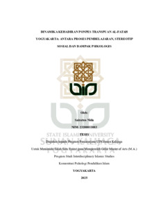Penelitian ini dilatarbelakangi oleh maraknya stereotip dan diskriminasi sosial terhadap kelompok transpuan dalam ruang-ruang keagamaan di Indonesia. Pondok Pesantren Transpuan Al-Fatah Yogyakarta hadir sebagai fenomena sosial dan keagamaan yang menantang norma-norma dominan terkait gender dan spiritualitas. Penelitian ini bertujuan untuk menganalisis tiga fokus utama yaitu bagaimana proses pembelajaran berlangsung di lingkungan pesantren transpuan, bagaimana stereotip sosial terbentuk dan dialami oleh para santri dan bagaimana dampak psikologis dari stereotip tersebut dirasakan serta direspons oleh para santri. Penelitian ini menggunakan pendekatan penelitian lapangan, jenis penelitian kualitatif dengan teknik deskriptif analisis. Teknik pengumpulan data dilakukan melalui observasi partisipan aktif, wawancara mendalam, dan dokumentasi. Analisis data dilakukan secara tematik dengan menggunakan pisau analisis teori interseksionalitas dan teori queer untuk memahami kompleksitas identitas santri transpuan dalam konteks keagamaan. Hasil penelitian menunjukkan bahwa proses pembelajaran di Pondok Pesantren Al-Fatah berlangsung secara inklusif, berbasis kebutuhan santri, dan berfokus pada rekonstruksi identitas spiritual transpuan. Stereotip sosial terhadap para santri masih sangat kuat, namun mulai mengalami pergeseran di lingkungan terdekat melalui pendekatan sosial dan keterlibatan aktif santri dalam kegiatan masyarakat. Secara psikologis, para santri mengalami tekanan akibat stigma sosial, namun lingkungan pesantren memberikan ruang pemulihan dan penguatan identitas melalui komunitas yang suportif.Kontribusi ilmiah dari penelitian ini terletak pada pengayaan wacana pendidikan Islam yang inklusif, serta penegasan pentingnya pendekatan interseksional dan teori queer dalam memahami dinamika identitas gender dalam ruang-ruang keagamaan. Penelitian ini juga membuka peluang pengembangan kurikulum keislaman yang lebih ramah terhadap keberagaman identitas serta mendukung penguatan kebijakan pendidikan berbasis hak asasi manusia.