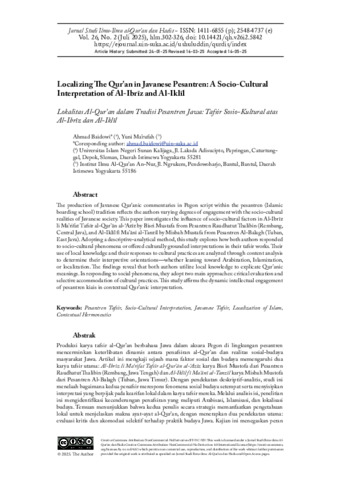 Ahmad Baidowi, - and Yuni Ma’rufah, - (2025) Localizing The Qur’an in Javanese Pesantren: A Socio-Cultural Interpretation of Al-Ibrīz and Al-Iklīl. JURNAL STUDI ILMU-ILMU AL-QURAN DAN HADIS, 26 (2). pp. 302-326. ISSN 1411-6855