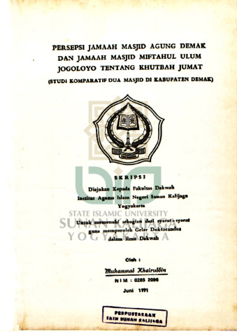Text (PERSEPSI JAMAAH MASJID AGUNG DEMAK DAN JAMAAH MASJID MIFTAHUL ULUM JOGOLOYO TENTANG KHUTBAH JUMAT (STUD! KOMPARATIF DUA MASJID DJ KABUPATEN DEMAK))