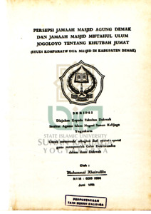 Muhammad Khairuddin, NIM.: 02852096 (1991) PERSEPSI JAMAAH MASJID AGUNG DEMAK DAN JAMAAH MASJID MIFTAHUL ULUM JOGOLOYO TENTANG KHUTBAH JUMAT (STUDI KOMPARATIF DUA MASJID DI KABUPATEN DEMAK). Skripsi thesis, UIN SUNAN KALIJAGA YOGYAKARTA.