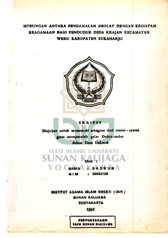 Badrun, NIM.: 02852129 (1991) HUBUNGAN ANTARA PENGAMALAN SHOLAT DENGAN KEGIATAN KEAGAMAAN BAGI PENDUDUK DESA KRAJAN KECAMATAN WERU KABUPATEN SUKOHARJO. Skripsi thesis, UIN SUNAN KALIJAGA YOGYAKARTA.