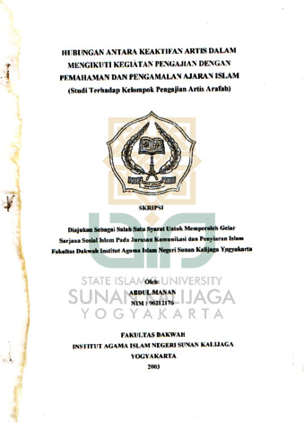 Text (HUBUNGAN ANTARA KEAKTIFAN ARTIS DALAM MENGIKUTI KEGIATAN PENGAJIAN DENGAN PEMAHAMAN DAN PENGAMALAN AJARAN ISLAM ( STUDI TERHADAP KELOMPOK PENGAJIAN ARTIS ARAFAH ))