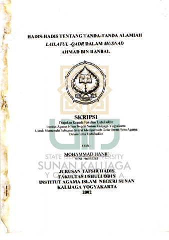 Muhammad Hanif, NIM.: 96532281 (2002) HADIS-HADIS TENTANG TANDA-TANDA ALAMIAH LAILATUL-QADR DALAM MUSNAD AHMAD BIN HANBAL. Skripsi thesis, UIN SUNAN KALIJAGA YOGYAKARTA.