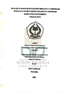 Siti Na'imah, NIM.: 97212206 (2003) NILAI-NILAI DAKWAH DALAM SENI SHOLAWAT CAMPURSARI: PENELITIAN DI DESA KEPEK, KECAMATAN WONOSARI, KABUPATEN GUNUNGKIDUL, YOGYAKARTA. Skripsi thesis, UIN SUNAN KALIJAGA YOGYAKARTA.