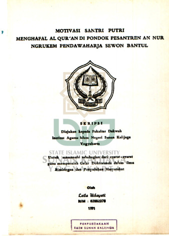 Text (MOTIVASI SANTRI PUTRI MENGHAFAL AL QUR’AN DI PONDOK PESANTREN AN NUR NGRUKEM PENDAWAHARJA SEWON BANTUL)